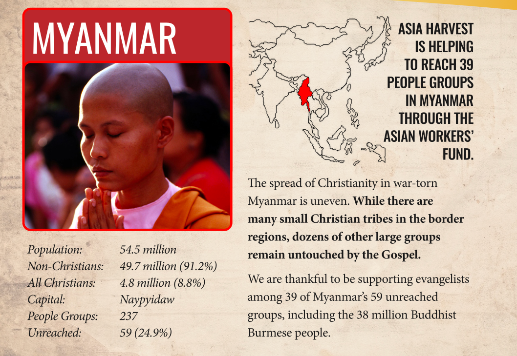 One example is the 38 million majority Burmese (Barma) people in Myanmar. Known as staunch Buddhists for the past thousand years, the Holy Spirit is moving, and it is likely that more Burmese have come to faith in Christ in the last five years than in the previous 200 years combined.